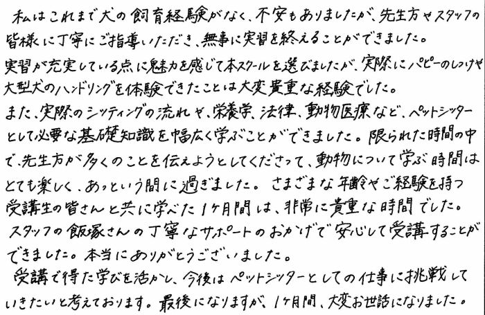 私はこれまで犬の飼育経験がなく、不安もありましたが、先生方やスタッフの皆様に丁寧にご指導いただき、無事に実習を終えることができました。実習が充実している点に魅力を感じて本スクールを選びましたが、実際にパピーのしつけや、大型犬のハンドリングを体験できたことは大変貴重な経験でした。また、実際のシッティングの流れや、栄養学、法律、動物医療など、ペットシッター として必要な基礎知識を幅広く学ぶことができました。限られた時間の中で、先生方が多くのことを伝えようとしてくださって、動物について学ぶ時間はとても楽しく、あっという間に過ぎました。