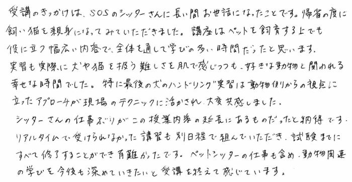 受講のきっかけは、SOSのシッターさんに長い間お世話になったことです。帰省の度に飼い猫を親身になってみていただきました。講座はペットを飼育する上でも役に立つ幅広い内容で、全体を通して学びの多い時間だったと思います。